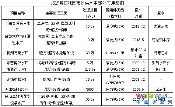 近年來,隨著膜性能的不斷提高,價格的逐漸降低,膜法水處理技術在城市供水領域的應用愈來愈多。超濾技術因其能夠將細菌、病毒、“兩蟲”、藻類、水生生物幾乎全部去除,是目前保障水微生物安全性的最有效技術。“目前,超濾技術作為一種綠色凈水工藝,在我國大型水廠中的應用已出現方興未艾的局面(部分案例見附表),水廠超濾膜的時代已經到來!”李圭白介紹說,“北京將建約50萬m3/d的超濾水廠,規(guī)模將是世界之最;大慶也將建27.5萬m3/d超濾水廠。”