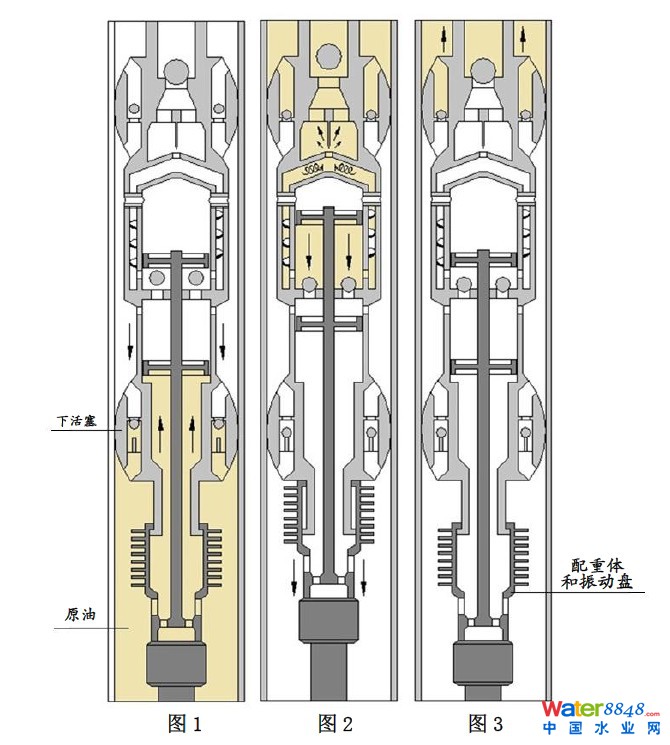 機(jī)械解堵采油器安裝在篩管下方,當(dāng)抽油機(jī)下沖程時(shí),油管柱彈性伸長,帶動(dòng)采油器向下移動(dòng),此時(shí),由于采油器的下活塞封堵了油套環(huán)形空間,采油器下移勢必?cái)D壓下部井液,迫使受壓井液通過下活塞的中心流道向上噴射,因此,配重體和振動(dòng)盤在這一反饋噴射沖擊力作用下向上移動(dòng),儲(chǔ)存重力勢能。上移至限位體時(shí)發(fā)生撞擊,產(chǎn)生振動(dòng)波(見圖1)。