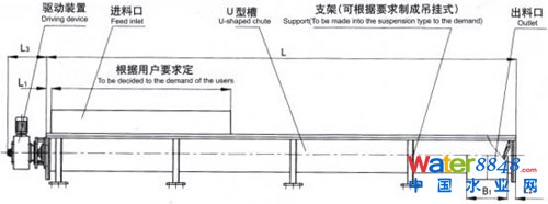 該產(chǎn)品由驅(qū)動裝置、無軸螺旋、U型槽、襯板、蓋板、進(jìn)出料口組成。物料落入進(jìn)料口后,經(jīng)無軸螺旋推動至出料口。