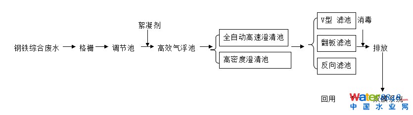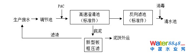 自來水廠的生產廢水主要來自沉淀池或澄清池排泥水和濾池反沖洗廢水,其中包含了原水中的雜質以及水廠投加的藥劑殘留物,其水量一般約占水廠總制水量的3%~7%,由于環(huán)境保護需要,這部分泥水不能直接排放,另外水資源成本越來越高,因此需對這部分水進行合理的回收處理和污泥脫水處置。工藝如下: