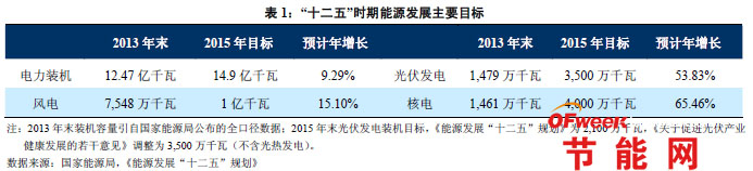 根據(jù)能源發(fā)展“十二五”規(guī)劃,到2015年我國(guó)電力裝機(jī)容量將達(dá)到14.9億千瓦,其中,風(fēng)電、太陽能和核電的裝機(jī)容量分別達(dá)到10,000萬千瓦、3500萬千瓦和4000萬千瓦。
