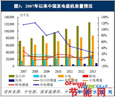 風(fēng)電是近年來發(fā)展最快的新能,風(fēng)電所發(fā)電量占所有電源發(fā)電量的比重自2008年的低于0.5%逐年增長(zhǎng)至2012年的2.00%左右,2013年進(jìn)一步增長(zhǎng)至2.5%以上。