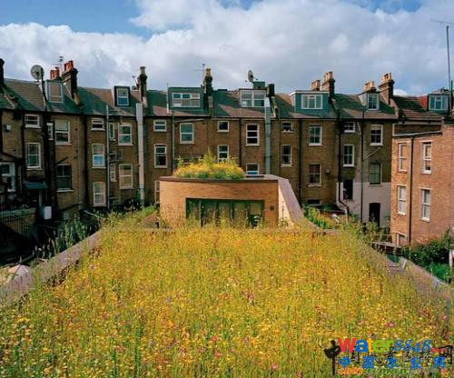 這些傳統(tǒng)舊式倫敦排房的窗戶(hù)曾經(jīng)一打開(kāi),看到的是破舊的香腸工廠(chǎng)。如今,居民看到的是野花盛開(kāi)的草坪。這是建筑師賈斯丁·比爾新家的綠屋頂。綠屋頂?shù)母綦x作用有助于提高家用太陽(yáng)能的利用效率。