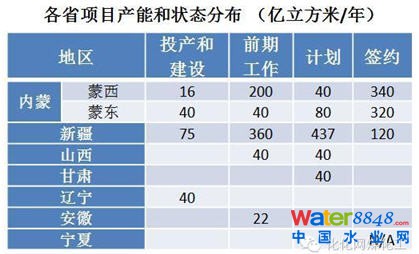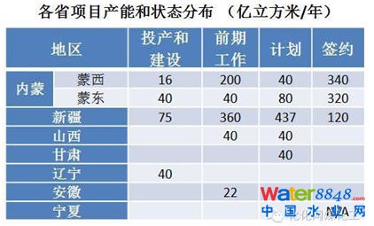 從項目的地理分布來看:全國計劃總產(chǎn)能2250億立方米/年中,內(nèi)蒙古分布產(chǎn)能1076億立方米,其中鄂爾多斯及周邊的蒙西地區(qū)占到596億,呼倫貝爾及周邊的蒙東地區(qū)占到480億立方米。新疆總計產(chǎn)能也達到992億立方米,其后是山西80億立方米,甘肅40億立方米,遼寧40億立方米,安徽22億立方米。