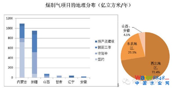 簡單計算,西北地區(qū)(新疆、蒙西和甘肅)的煤制氣計劃產(chǎn)能占到全國72.4%。