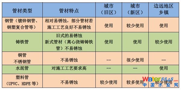 從全國范圍來看, 管材是各種各樣五花八門。從相對易銹蝕的鋼管(鍍鋅鋼管, 鋼塑復(fù)合管等)、舊式鑄鐵管,到不易銹蝕的銅管、不銹鋼管乃至塑料管,在城市舊區(qū)、新區(qū),以及鄉(xiāng)鎮(zhèn)地區(qū)都有不同的使用情況。