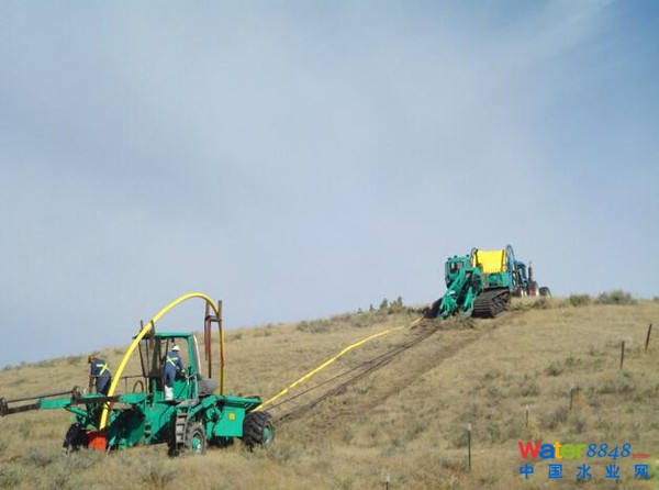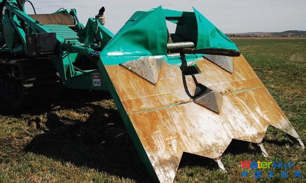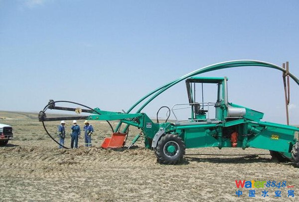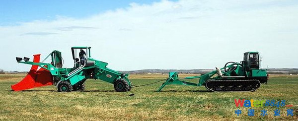 工作時需要一到兩臺貌似挖掘機的機器在前面開路,管道開溝機在后面邊挖邊鋪設(shè)管道。