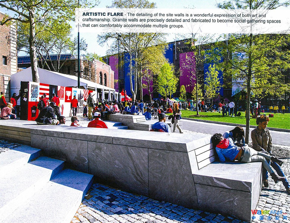 該綠地空間坐人矮墻的細(xì)節(jié)設(shè)計完美地詮釋了景觀藝術(shù)與墻體砌筑工藝的和諧共融;◢弾r墻體構(gòu)造細(xì)膩、工藝精湛,將休梅克綠地營造成為一處能輕松容納多個團(tuán)體的社交空間。