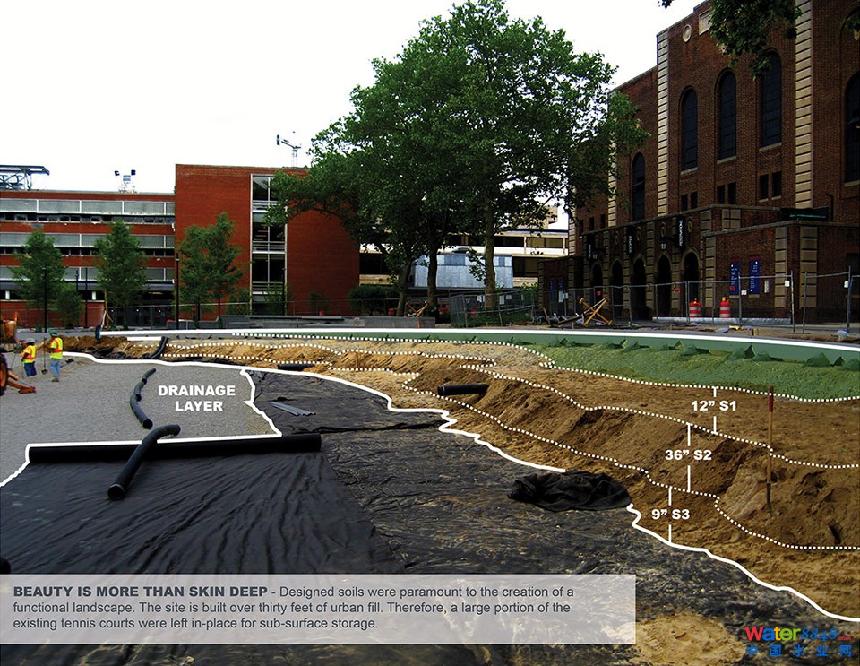對于打造具有全面功能的休梅克綠地,地下土壤的合理設(shè)計更為重要。項目場地原先是一處深達(dá)30英尺的城市土堆,因此,現(xiàn)有的網(wǎng)球場大部分得以原地保留,以形成富有層次感的地下儲水系統(tǒng)。