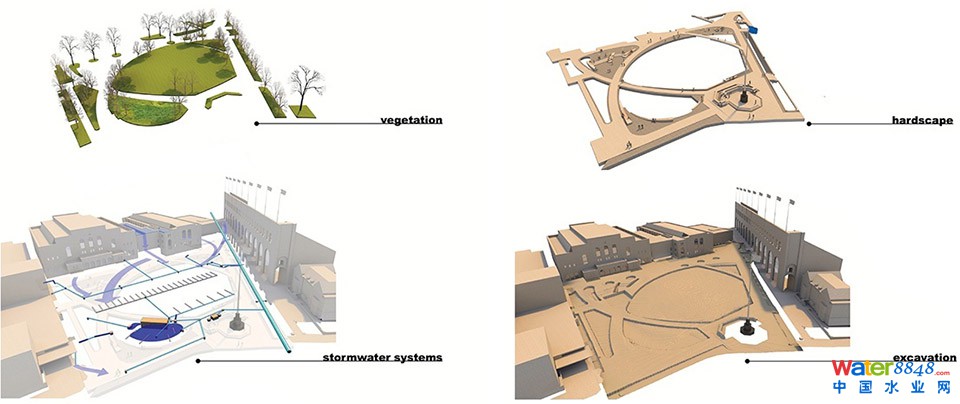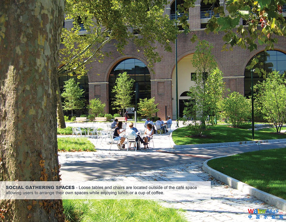 休梅克綠地創(chuàng)造了一個多功能的校園景觀空間,它不僅提供了良好的生態(tài)系統(tǒng)服務(wù)功能,而且還滿足了賓夕法尼亞大學(xué)提出的相關(guān)計劃要求。該綠地的功能化運行如同人的腎臟,通過一個綜合性景觀系統(tǒng),收集了整個場地95%的雨水量,對雨水進(jìn)行傳送、過濾及存儲,之后可以用于灌溉。其余的水源需求則依靠毗鄰建筑的屋頂雨水徑流及空調(diào)冷凝水。