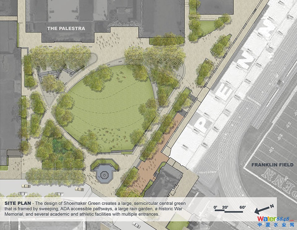休梅克綠地總共占地2.75英畝,緊靠第33街東面,位于沃爾納特街與斯普魯斯兩條街道之間。該項目將荒廢已久的網(wǎng)球場和幾條狹窄的通道以及具有歷史意義的戰(zhàn)爭紀(jì)念碑景點組成的場地改造為費城西部地區(qū)的公共綠化空間設(shè)施。該設(shè)計借鑒了賓夕法尼亞大學(xué)傳統(tǒng)校園綠地的特點,營造出一種似曾相識的視覺,同時將緊鄰的各建筑入口、人行道、路緣石和陡峭斜坡階梯進(jìn)行了整合。整塊綠地是賓夕法尼亞大學(xué)東西方向主體步行系統(tǒng)的重要組成部分,它將校園中心區(qū)與田徑運動場連接起來,同時也是賓夕法尼亞大學(xué)校區(qū)向東擴(kuò)建的重點區(qū)域。在該場地的邊緣是賓夕法尼亞大學(xué)最具標(biāo)志性的體育設(shè)施:菲爾德豪斯體育場和富蘭克林運動場,休梅克綠地成為了這兩大歷史性建筑設(shè)施的前庭空間。該項目為可持續(xù)性校園設(shè)計樹立了標(biāo)桿,同時獲得了可持續(xù)場地倡議組織的二星榮譽(yù)。