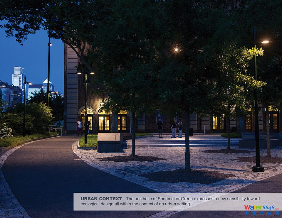 休梅克綠地已成為罕見的綠色基礎(chǔ)設(shè)施典范,究其原因,它是一個經(jīng)過嚴(yán)格檢測的高效能景觀項目,可以將水源進(jìn)行回收、過濾,并有效地將清潔的水資源重新回流到環(huán)境中。一份歷時五年的監(jiān)測規(guī)劃的制定,最終使得景觀建筑師、賓夕法尼亞大學(xué)教職員工及學(xué)生,以及廣大公眾都有機(jī)會共同參與到這一真正意義上的“生態(tài)景觀系統(tǒng)”中去。該項目的景觀設(shè)計師們與賓夕法尼亞大學(xué)教職員工及學(xué)生代表共同對以下幾個方面做了積極而深入的監(jiān)測——項目場地進(jìn)出雨水的數(shù)量和質(zhì)量;對項目系統(tǒng)程式化運作起到支持性作用的土壤的生物性質(zhì)、多樣性、演變過程、碳穩(wěn)固性、養(yǎng)分循環(huán)以及土質(zhì)本身;植栽材料的健康狀況(即生長與根部發(fā)育狀況)及其對土壤水分的蒸散量;灌溉水源獲取及再利用系統(tǒng)的運行性能及效率;人們對該綠地使用頻率的跟蹤監(jiān)測;生態(tài)關(guān)聯(lián)性和人們對于綠地景觀的感知與體驗——從而將促成賓夕法尼亞大學(xué)關(guān)于綠化環(huán)境維系方面的長久性校規(guī)的出臺。對于項目場地性能的精心設(shè)計與持續(xù)性監(jiān)測將有助于未來大學(xué)校園的景觀設(shè)計,同時也有助于對美國國家可持續(xù)性景觀設(shè)計指南和建筑規(guī)范的修訂產(chǎn)生積極的影響。