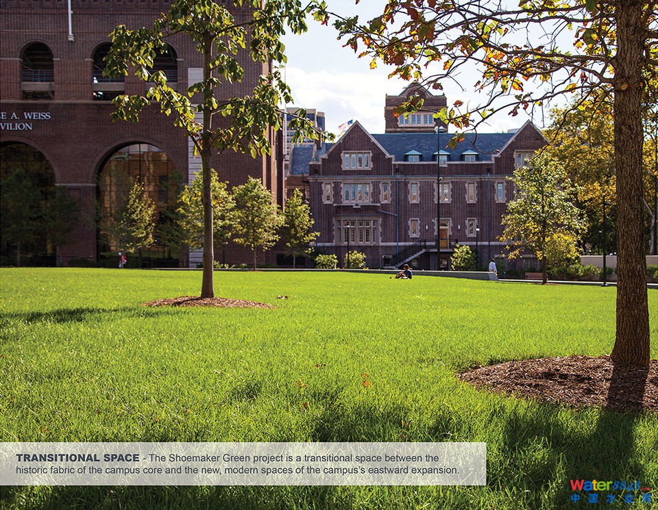 在斯庫基爾河沿岸賓夕法尼亞大學(xué)校園區(qū)域連接總體規(guī)劃中,休梅克綠地成為了校園中央古老建筑結(jié)構(gòu)與更為現(xiàn)代的新型時尚開放空間之間的一個過渡。該綠地繼續(xù)秉承原有的刺槐/史密斯步行道的設(shè)計特點,并同時吸納了賓夕法尼亞大學(xué)傳統(tǒng)的校園綠化景觀元素,同時融入了新的設(shè)計元素,這些都反映了可持續(xù)發(fā)展及生態(tài)景觀設(shè)計的重要性。