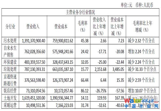 ①水務固廢等環(huán)保業(yè)務:實現(xiàn)營業(yè)收入348,062.32萬元,為公司營業(yè)總收入的62.27%。公司通過積極拓展市場,新收購的水務項目運營及首創(chuàng)環(huán)境固廢收入增加是收入增長的主要原因。