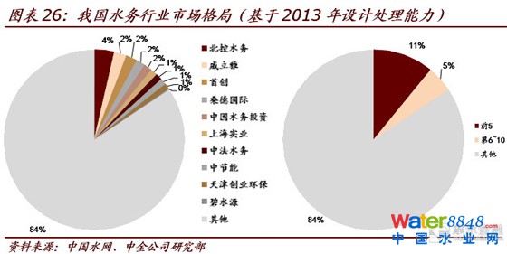 我國水務行業(yè)較為分散而且主要以非市場化方式運營,尤其是供水與市政污水處理市場。行業(yè)中的前五和前十市場占有率分別只有11%和16%。即便是龍頭企業(yè)北控水務市場份額也只有3.6%。與之相對的是,50%的現(xiàn)有市場污水處理能力和70%的供水能力掌握在地方政府手中。