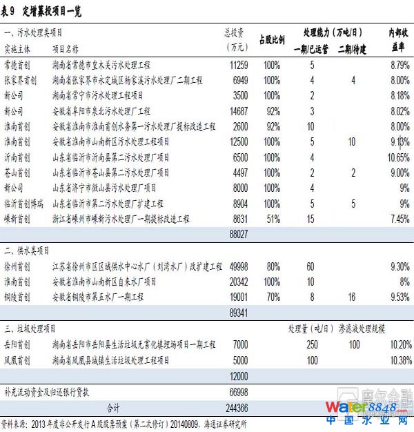 2013年8月發(fā)布非公開發(fā)行預案,14年末已核準,以15個市政項目與補充流動性資金為募投方向,募集資金20.54億元。預案中涉及10個污水處理項目,處理能力合計59萬噸/日、3個供水項目,處理能力合計79萬噸/日和2個生活垃圾處理項目,處理能力合計350噸/日。(Ps下圖有錯,淮南首創(chuàng)1.25億的項目在第二次修訂中取消了,補充流動資金改成6.1億)