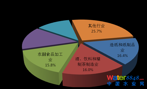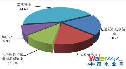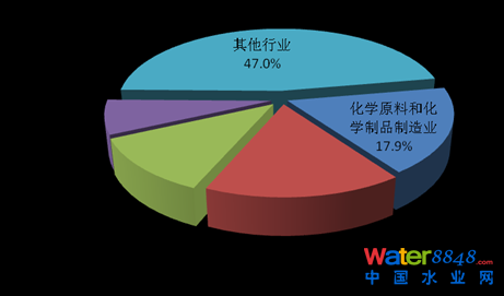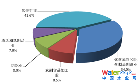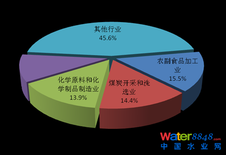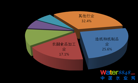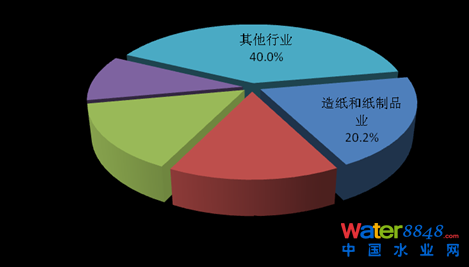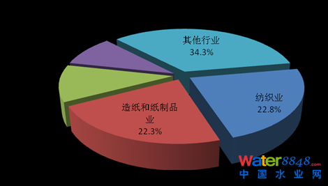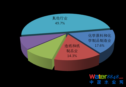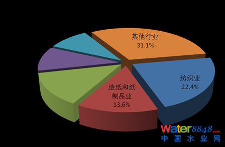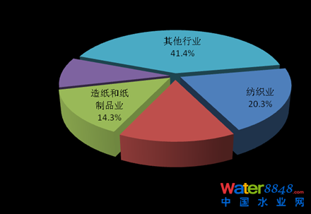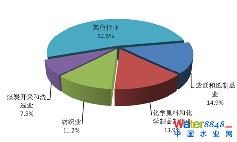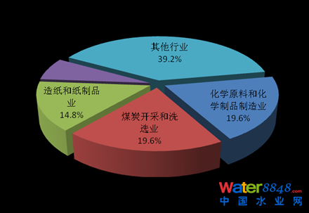 2013年,在調(diào)查統(tǒng)計(jì)的41個(gè)工業(yè)行業(yè)中,廢水排放量位于前4位的行業(yè)依次為造紙和紙制品業(yè),化學(xué)原料及化學(xué)制品制造業(yè),紡織業(yè),煤炭開(kāi)采和洗選業(yè),4個(gè)行業(yè)的廢水排放量為90.8億噸,占重點(diǎn)調(diào)查工業(yè)企業(yè)廢水排放總量的47.5%。