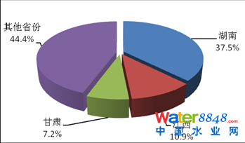 工業(yè)廢水中鎘排放量前3位的省份依次為湖南、江西和甘肅,3個(gè)省份工業(yè)廢水鎘排放量為9.9噸,占全國(guó)工業(yè)廢水鎘排放量的55.6%。
