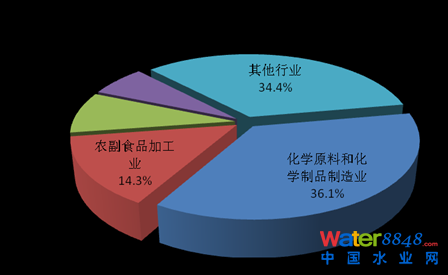 2013年,在調(diào)查統(tǒng)計(jì)的41個(gè)工業(yè)行業(yè)中,三峽庫(kù)區(qū)及其上游流域廢水排放量位于前4位的行業(yè)依次為化學(xué)原料和化學(xué)制品制造業(yè),煤炭開(kāi)采和洗選業(yè),造紙和紙制品業(yè),酒、飲料和精制茶制造業(yè),4個(gè)行業(yè)的廢水排放量為7.3億噸,占重點(diǎn)調(diào)查工業(yè)企業(yè)廢水排放總量的60.8%。