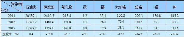 2013年,全國(guó)工業(yè)廢水中石油類(lèi)排放量1.7萬(wàn)噸,比上年增加0.4%;揮發(fā)酚排放量1259.1噸,比上年減少15.0%;氰化物排放量162.0噸,比上年減少5.7%。
