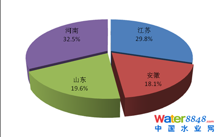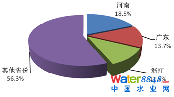 2013年,廢水排放量大于30億噸的省份共8個(gè),依次為廣東、江蘇、山東、浙江、河南、河北、四川、湖南,8個(gè)省份廢水排放總量為370.9億噸,占全國(guó)廢水排放量的57.6%。工業(yè)廢水排放量前3位的是江蘇、山東和廣東,分別占全國(guó)工業(yè)廢水排放量的10.5%、8.6%和8.1%。城鎮(zhèn)生活污水排放量前3位依次是廣東、江蘇、山東,分別占全國(guó)城鎮(zhèn)生活污水排放量的14.3%、7.7%和6.5%。
