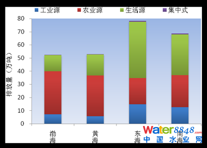 沿海地區(qū)氨氮排放總量為29.7萬(wàn)噸。其中,工業(yè)廢水氨氮為2.7萬(wàn)噸,農(nóng)業(yè)源氨氮為9.5萬(wàn)噸,城鎮(zhèn)生活污水氨氮為17.4萬(wàn)噸。其中,工業(yè)、農(nóng)業(yè)、城鎮(zhèn)生活氨氮排放量最大的均為東海,分別占整個(gè)沿海地區(qū)的34.1%、33.7%和44.0%。