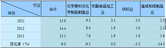 2013年,在調(diào)查統(tǒng)計(jì)的41個(gè)工業(yè)行業(yè)中,氨氮排放量位于前4位的行業(yè)依次為化學(xué)原料及化學(xué)制品制造業(yè),農(nóng)副食品加工業(yè),紡織業(yè),造紙和紙制品業(yè),4個(gè)行業(yè)的氨氮排放量13.1萬(wàn)噸,占重點(diǎn)調(diào)查工業(yè)企業(yè)排放總量的58.4%,較上年下降0.9個(gè)百分點(diǎn)。