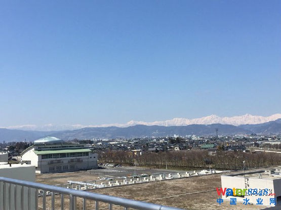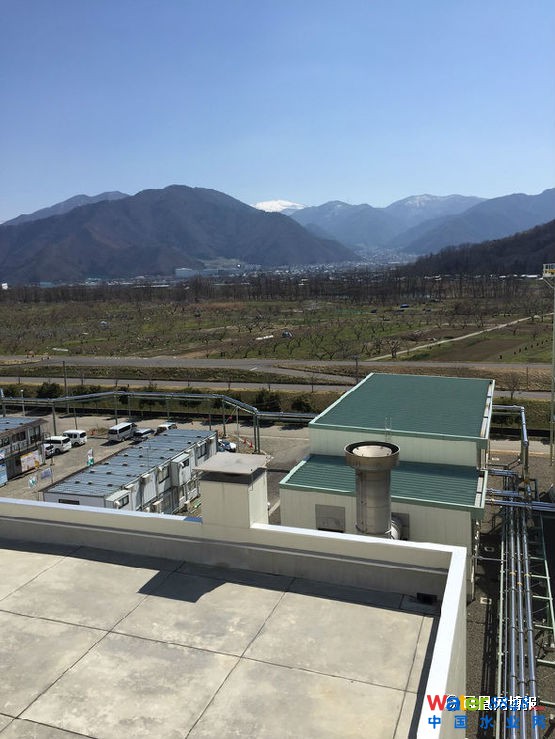 參觀完污水處理的地下,我們來到了放置淤泥焚燒爐的建筑物。首先,我們來到了樓頂,登高遠(yuǎn)望,發(fā)現(xiàn)這里周圍的環(huán)境風(fēng)景美如畫,可以眺望到遠(yuǎn)處還有積雪的日本阿爾卑斯山脈。而眼前的這個(gè)污水處理廠與周圍的景色竟然和諧共存,沒有任何違和感。