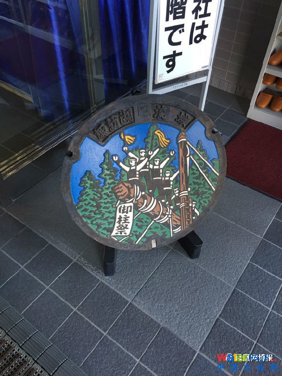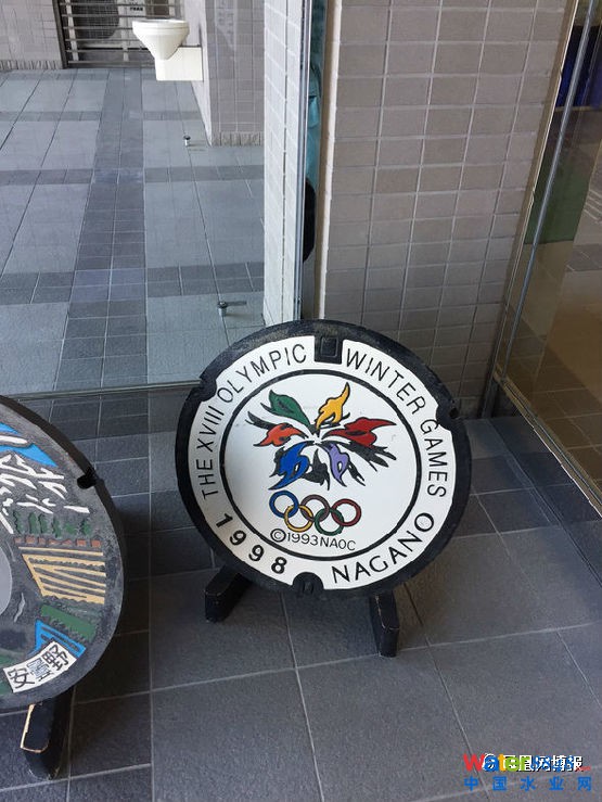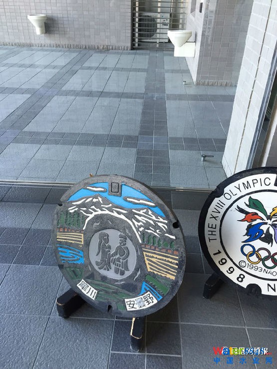 辦公樓門口裝飾著幾個(gè)設(shè)計(jì)別致又富有地區(qū)特色的下水道井蓋。曾在網(wǎng)上看到過介紹日本的下水道井蓋設(shè)計(jì)精美的文章,意在說明日本重視細(xì)節(jié)到了不放過井蓋。還真是這樣,這個(gè)污水處理廠管轄區(qū)域內(nèi)的各個(gè)市町村都設(shè)計(jì)有代表自己地區(qū)特色的井蓋。