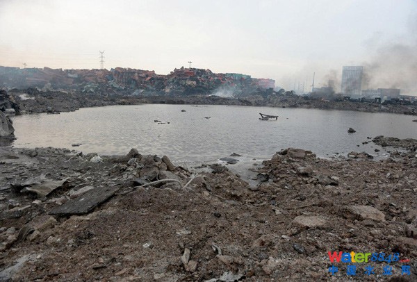 天津濱;瘜W品爆炸現(xiàn)場煙霧逐步散去,爆炸“原點”現(xiàn)出一個巨大的坑,坑內(nèi)有大量液體,深度未明