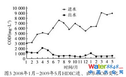啟動(dòng)期間投加淀粉廠HDIC反應(yīng)器的顆粒污泥,初始進(jìn)水COD<5000 mg/L,當(dāng)出水VFA<200mg/L,pH、ALK、COD正常,即進(jìn)入提高負(fù)荷階段;在進(jìn)入提高負(fù)荷階段后,控制出水VFA、pH、ALK、COD 指標(biāo)。調(diào)試后期即2009年3月以后.盡管進(jìn)水COD值較高,出水COD仍在較低的范圍之內(nèi),系統(tǒng)進(jìn)入穩(wěn)定運(yùn)行。每天監(jiān)測(cè)COD兩次,間隔12 h取樣一次,17個(gè)月的檢測(cè)結(jié)果表明HDIC總體處理效率高于設(shè)計(jì)值。