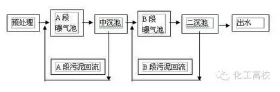 AB法屬超高負(fù)荷活性污泥法。AB工藝對(duì)BOD5、COD、SS、磷和氨氮的去除率一般均高于常規(guī)活性污泥法。其突出的優(yōu)點(diǎn)是A段負(fù)荷高,抗沖擊負(fù)荷能力強(qiáng),對(duì)pH和有毒物質(zhì)具有較大的緩沖作用,特別適用于處理濃度較高、水質(zhì)水量變化較大的廢水。楊俊仕等采用水解酸化-AB生物法工藝處理抗生素廢水,工藝流程短,節(jié)能,處理費(fèi)用也低于同種廢水的化學(xué)絮凝-生物法處理方法。