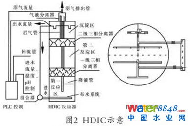 HDIC(厭氧多循環(huán)反應(yīng)器)將EGSB和IC兩種工藝相結(jié)合,在已有的IC反應(yīng)器基礎(chǔ)上增加EGSB出水回流,并設(shè)置了內(nèi)回流和沼氣回流,強(qiáng)化了反應(yīng) 器內(nèi)循環(huán),使得液體上升流速增大,容積負(fù)荷高且產(chǎn)氣量大;顆粒污泥的沉降速度遠(yuǎn)大于液體的上升流速,顆粒污泥不會(huì)因?yàn)橐后w的紊動(dòng)而流失,保證了反應(yīng)器內(nèi)的 污泥濃度;反應(yīng)器的啟動(dòng)時(shí)間短,高徑比大,占地面積小。由于厭氧出水水質(zhì)一般達(dá)不到排放標(biāo)準(zhǔn),仍需后接好氧處理。