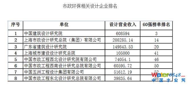 上榜的“2015年中國(guó)工程設(shè)計(jì)企業(yè)60強(qiáng)”中,中國(guó)建筑設(shè)計(jì)研究院、同濟(jì)大學(xué)建筑設(shè)計(jì)研究院(集團(tuán))有限公司、上海市政設(shè)計(jì)研究總院(集團(tuán))有限公司、廣東省建筑設(shè)計(jì)研究院、上海城市建設(shè)設(shè)計(jì)研究總院、中國(guó)市政工程西北設(shè)計(jì)研究院有限公司、中國(guó)市政工程西南設(shè)計(jì)研究總院有限公司、中國(guó)市政工程?hào)|北設(shè)計(jì)研究總院有限公司等八家市政環(huán)保相關(guān)的設(shè)計(jì)單位入選,這八家單位中,有5家(華北院、上海院、西北院、西南院、東北院)來(lái)自在業(yè)內(nèi)公認(rèn)的“中國(guó)市政工程設(shè)計(jì)八大院”(考慮到垃圾處理工程設(shè)計(jì)在國(guó)內(nèi)起步較晚,這個(gè)八大院起家的基礎(chǔ)是以傳統(tǒng)的給排水專(zhuān)業(yè)為主),而同屬“八大院”的北京院、天津院及中南院則落選此次排名。