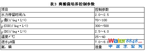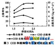 根據酚的可生化性能及進水有機負荷,對含酚廢水的處理進行了三種水力停留時間(HRT)的實驗,分別為2.5h,2.0h和1.5h主要污染物的平均進、出水變化見表4。