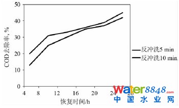 這里所討論的反沖洗時間為氣水聯洗階段的時間。在BAF 反沖洗的過程中,水反沖洗強度、氣反沖洗強度和氣水同時反沖洗時間對反沖洗效果有較大的影響,而氣水同時反沖洗是氣水聯合反沖洗過程中最關鍵的一步。為摸索最適合的反沖洗時間,固定水反沖強度和氣沖強度,分別考查反沖洗時間為5 min、10 min 條件下BAF 對COD 的去除效果。