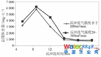 根據有關資料,氣反沖效率的影響明顯大于水沖強度變化的影響。因此,這里只考查了氣沖強度變化對反沖洗的影響。首先固定水沖強度,對比反沖洗氣強度在20 ~ 40 m3 /min 的氣沖效率,通過分析反沖洗液中的總固體含量來選擇控制范圍。
