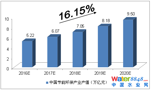 預(yù)計(jì)2016年中國(guó)節(jié)能環(huán)保產(chǎn)業(yè)產(chǎn)值將達(dá)到5.22萬(wàn)億元,未來(lái)五年(2016-2020)行業(yè)年均復(fù)合增長(zhǎng)率約為16.15%,2020年中國(guó)節(jié)能環(huán)保產(chǎn)業(yè)產(chǎn)值將達(dá)到9.5萬(wàn)億元。