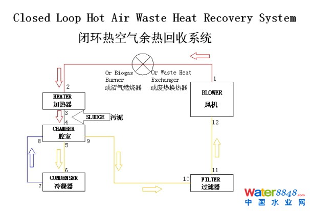 高溫、高壓空氣具有理想的熱傳遞效率。膨脹后的空氣與污泥進(jìn)行了負(fù)壓條件下的熱交換,并攜帶出大量水蒸氣,再通過冷凝器除去攜帶的水分,冷卻后的空氣在管路中途經(jīng)干化室利用未被污泥吸收的余熱進(jìn)行預(yù)加熱,再經(jīng)過濾器濾掉攜帶的雜質(zhì)后回送到鼓風(fēng)機(jī),循環(huán)利用,降低了能源消耗。