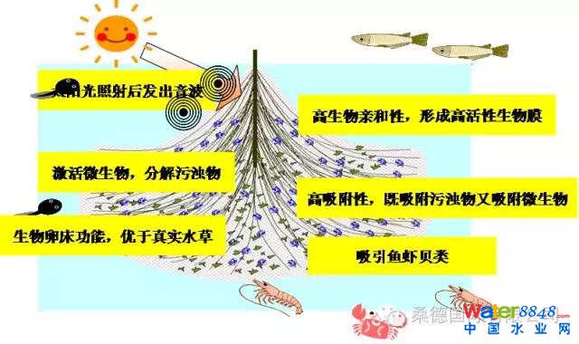 圖一生物碳纖維在凈化受污染水域和修復(fù)水環(huán)境生態(tài)示意圖