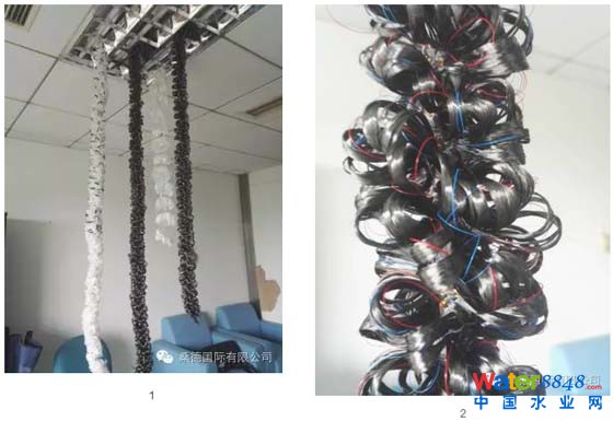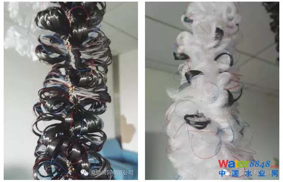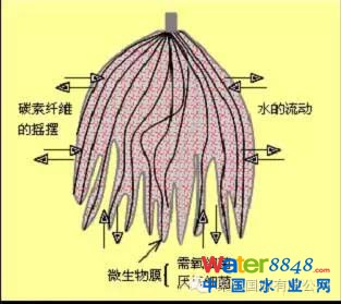 填料采用了引進(jìn)自德國的編成組織技術(shù),以PP棉為襯底,滌綸絲為骨架,碳纖維為核心裝配而成。在厭氧池中可像水草般飄動,增加處理面積,且具有剛性,不易纏繞堵塞,是厭氧工藝的理想伴侶。其中生物碳纖維的引入為微生物在填料表面附著形成的生物膜提供微電解環(huán)境,使得電負(fù)性和電正性生物膜在纖維表面分散排布、各司其職亦能以填料為媒介進(jìn)行電子交換,使得難降解有毒物質(zhì)在填料表面分段降解,提高厭氧工藝的整體轉(zhuǎn)化效率。