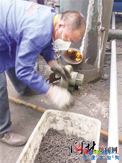 廠區(qū)北側(cè)有兩臺(tái)用于中試的小型鍋爐,其中0.5噸的鍋爐正在試驗(yàn)運(yùn)行,用于將焚燒方式調(diào)整到最優(yōu)狀態(tài)。工人不時(shí)將深加工形成的污泥燃料棒送進(jìn)去,爐膛內(nèi)烈焰熊熊。