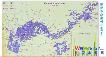 1954年,長江中下游地區(qū)雨季提前到來,洪水發(fā)生也比一般年份早,洞庭湖、鄱陽湖水系于4月份即進入汛期,長江中下游干流高水位持續(xù)時間長,漢口至南京江段水位自6月25日起全線超過警戒水位,超警歷時一般在100天~135天,中下游洪水位全線突破當時的歷史最高值。長江中下游洪水與川水遭遇,形成全流域性大洪水。該年該年長江上游宜昌站最大洪峰流量66 800 m3/s,在無奈情況下考慮荊江分洪方案,雖保住武漢市,但受災人口1890萬,被淹房屋427.66萬間,淹死3.4萬人,淹沒良田317萬公頃,受災縣市123個,京廣鐵路不能通車達100天,損失數(shù)十億元。在荊江采取分洪措施后,沙市最高水位仍達44.67m;中游漢口站最高水位29.73m,超過1931年的最高水位,相應流量76 100 m3/s;下游大通站最高水位16.64m,相應流量92 600 m3/s。最大30天洪量,1954年分洪潰口水量達1 023億m3【圖為】1954年的武漢洪水,漢口著名的標致性建筑物——江漢關(guān)的街道上已成澤國