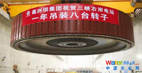 2010年7月,三峽電站機組實現(xiàn)了電站1820萬kW滿出力168小時運行試驗目標(日發(fā)電量可突破4.3億kWh電,占當時全國日發(fā)電量的5左右)。1949年,中國總發(fā)電量僅為43億kWh【圖為】三峽水電站右岸第8臺轉(zhuǎn)子吊裝。
