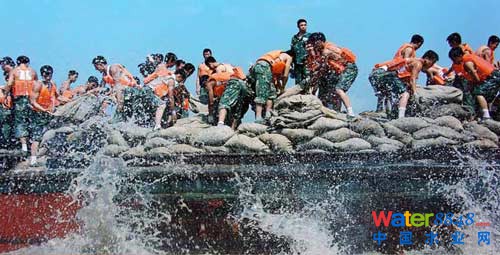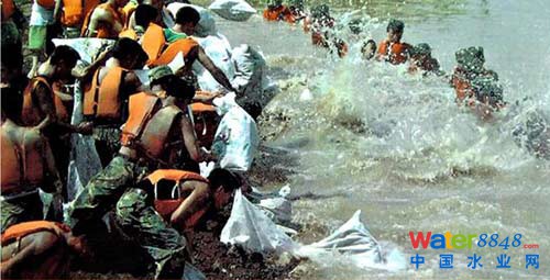 1998年長江洪水是繼1954年以來的又一次全流域性大洪水,長江中下游干流沙市至螺山、武穴至九江共計359km的河段水位超過了歷史最高水位。鄱陽湖水系五河、洞庭湖水系四水發(fā)生大洪水后,長江上中游干支流又相繼發(fā)生了較大洪水,長江上游接連出現(xiàn)8次洪峰。據(jù)分析:1998年7~8月,長江上游來水量略大于1954年,中、下游水量略小于1954年【圖為】1998年8月25日,沈陽軍區(qū)某舟橋團官兵奮力封堵被洪水沖垮的堤壩