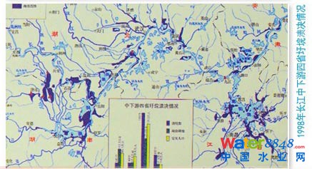 三峽水庫的泄洪閘最大泄洪流量是按照1870年長江大洪水為設計依據(jù),泄洪流量可達10.25萬m3/s,是世界上泄洪能力最大的泄洪閘。其洪水調(diào)節(jié)能力強大,可以消減洪峰流量高達2.7~3.3萬m3/s。該水利工程可以有效控制長江上游洪水,受其保護的長江中下游的地區(qū),其人口大約為1500萬,土地約為2300萬畝。通過調(diào)節(jié)洪水到達前所調(diào)節(jié)的實際壩前水位以及泄洪流量,至少可實現(xiàn)不同的防洪目標,甚至可以抵抗千年一遇的洪水【圖為】1931~1998年期間,長江流域發(fā)生的4大洪水淹沒范圍圖