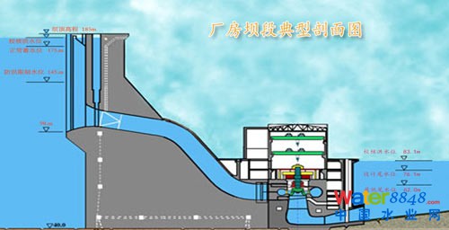三峽大壩為混凝土重力壩,它壩長2335m,底部寬115m,頂部寬40m,壩頂高程為海拔185m,最大澆筑壩高181m,正常蓄水位海拔175m。大壩下游的水位約海拔66m,壩下通航最低水位海拔62m,通航船閘上下游設計最大落差113m。工程主體建筑物的土石方挖填量約1.34m3,混凝土澆筑量約2794萬m3,耗用鋼材59.3萬噸。其中金屬結(jié)構(gòu)安裝占25.65萬噸,鋼筋制作安裝46.30萬噸。水庫全長600余km,壩軸線全長2309.47m,水面平均寬度1.1km,總面積1084km2,總庫容393億m3,其中調(diào)洪庫容約221.5億m3,調(diào)節(jié)能力為季調(diào)節(jié)型【圖為】三峽水利樞紐工程廠房壩段模型剖面圖。