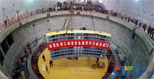 2002年3月17日,三峽工程首臺發(fā)電機組轉(zhuǎn)子吊裝成功。轉(zhuǎn)輪的順利安裝為三峽工程在2003年實現(xiàn)首批機組發(fā)電創(chuàng)造了條件【圖為】三峽地下電站第二臺機組轉(zhuǎn)子成功安裝