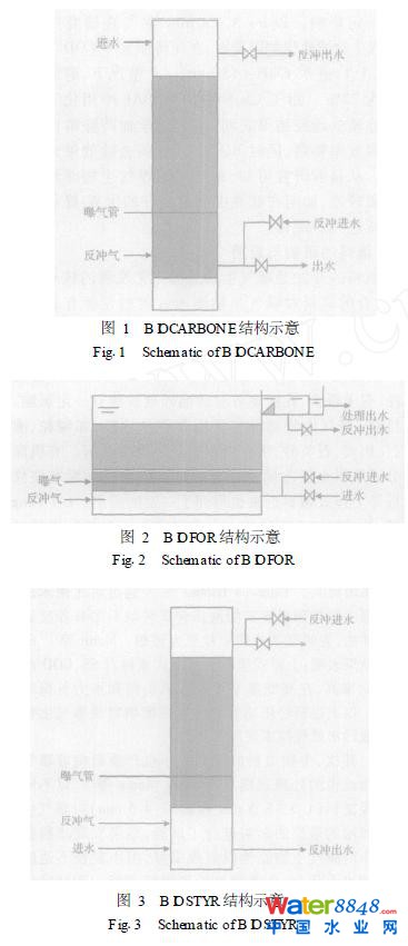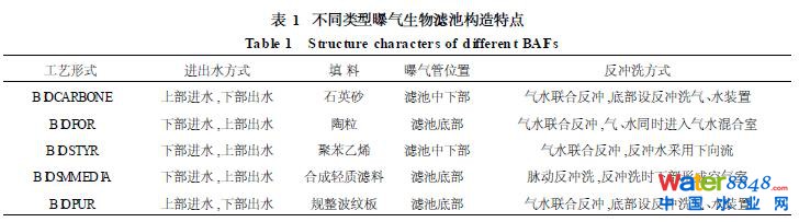 近年來曝氣生物濾池發(fā)展迅速,工藝形式不斷推陳出新, 曾先后出現(xiàn)過B IOCARBON、B IOFOR、B IOSTYR、B IOSMED I、B IOPUR、COLOX、DeepBed等形式,其中B IOCARBON、B IOFOR、B IOSTYR、B IOS2MED I、B IOPUR是現(xiàn)代曝氣生物濾池幾種典型的運行工藝, 在世界范圍內(nèi)都有應(yīng)用, 其構(gòu)造特點見表1。B IOCARBON (圖1)為早期開發(fā)的工藝形式,現(xiàn)在曝氣生物濾池則多采用B IOFOR (圖2)和B IO2STYR (圖3)形式。