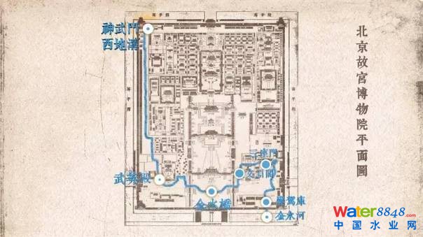 除了地勢選擇上的優(yōu)勢,流經(jīng)大半個紫禁城的內(nèi)金水河,無疑是整個排水系統(tǒng)的主角。內(nèi)金水河所引為西郊玉泉山水,因西在五行中屬金,“金生麗水”,故名金水河,全長2000多米,由神武門西地溝引護(hù)城河水流入宮內(nèi),沿西一帶經(jīng)武英殿前,至太和門前金水橋下,復(fù)流經(jīng)文淵閣前至三座門,從鑾駕庫東南出紫禁城。